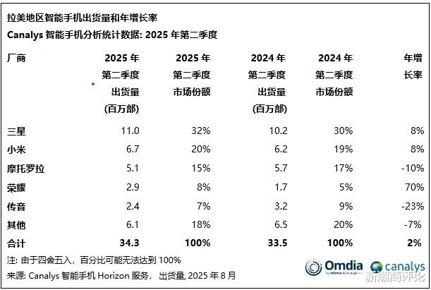 年轻人口多、消费潜力大,拉美市场成为众多智能手机厂商的“必争之地”。根据知名调研机构Canalys的数据显示,在2025年第一季度同比下滑4%、结束连续六个季度增长之后,第二季度拉美智能手机出货量重拾增长,同比增长2%至3430万部。