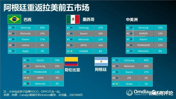 三星稳居榜首,在巴西、墨西哥、中美洲、阿根廷均位列第一,市场份额分别为40%、23%、33%、40%。整体出货量达到1100万部,同比提升8%,去年推出的Galaxy A06和A16机型占比超过六成。