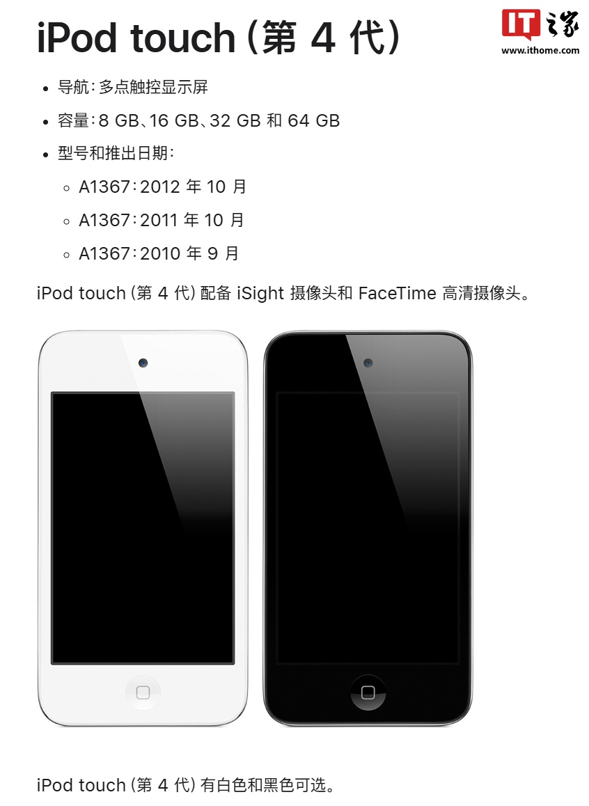 IT之家注:苹果于 2010 年 9 月推出了 iPod touch(第 4 代)。其采用了 3.5 英寸 Retina 显示屏,搭载与 iPhone 4 相同的 A4 处理器,提供 8GB、16GB、32GB 和 64GB 容量可选。